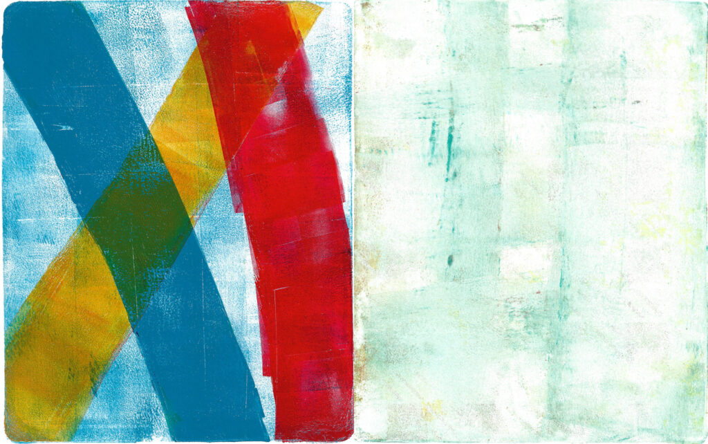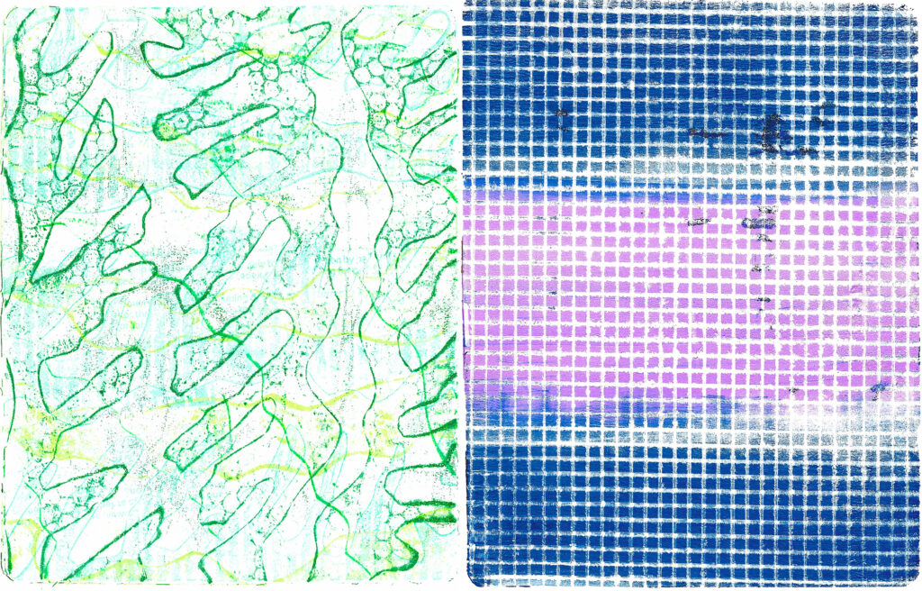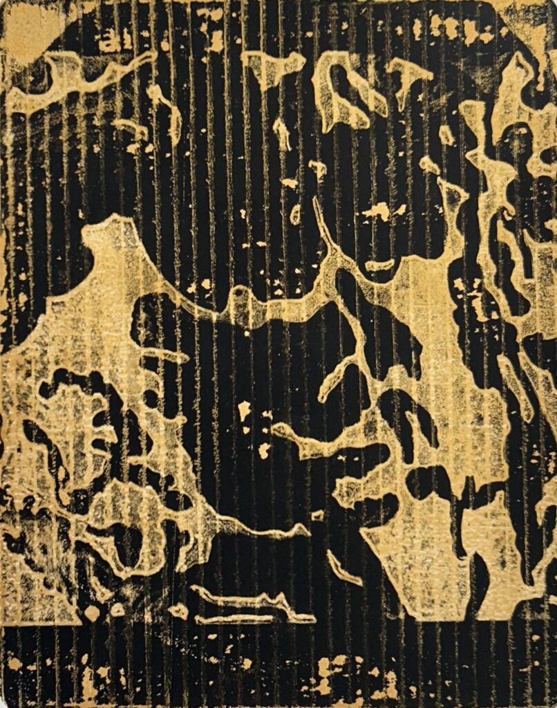 J: I have been doing printmaking since college but started using a gelli plate in January 2025. The process begins with rolling out a layer of acrylic paint on the gelli plate. I use stencils and other objects laid on the gelli plate.