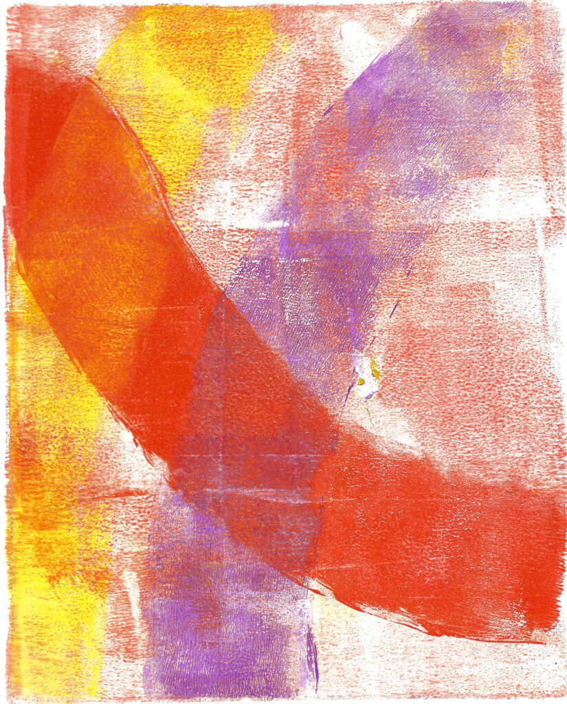 J: With prints 231 & 95, I used a small roller to roll out the stripes of color on the plate and layered the stripes to get depth with the blending of the colors.