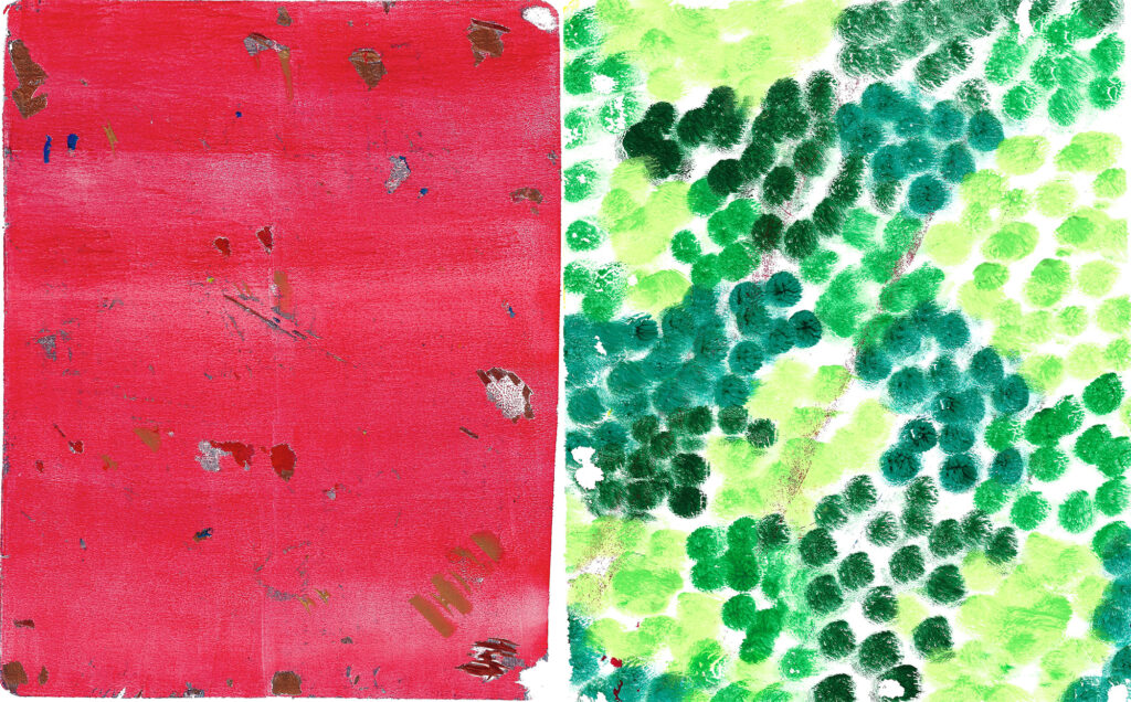 Once you lift the objects, a void is left on the plate. The original layer of paint dries, and then you can roll on another layer. While the second layer is still wet, I lay paper on the plate and then let it dry. You pull the paper off, and the image has transferred from the plate to the paper.