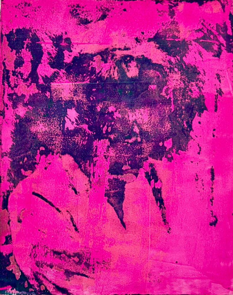 J: With print 131, I love this effect. This happens when not all of the paint pulls off the plate. Instead of cleaning the plate, I use what is left and add to it to then create another print.