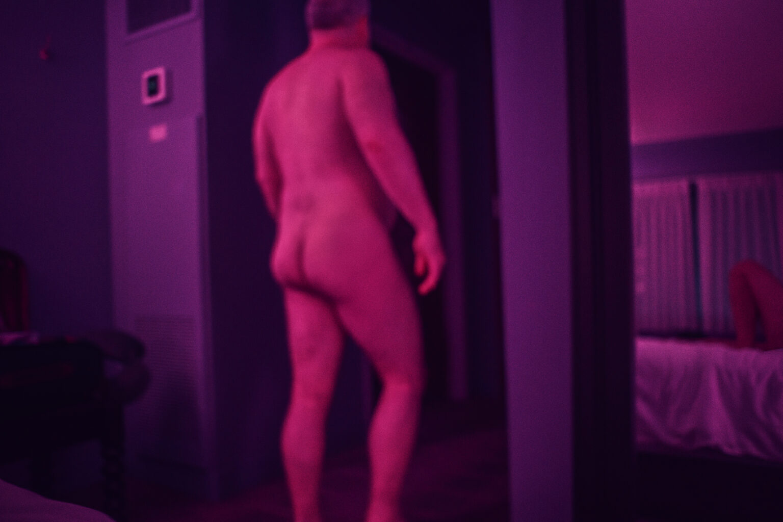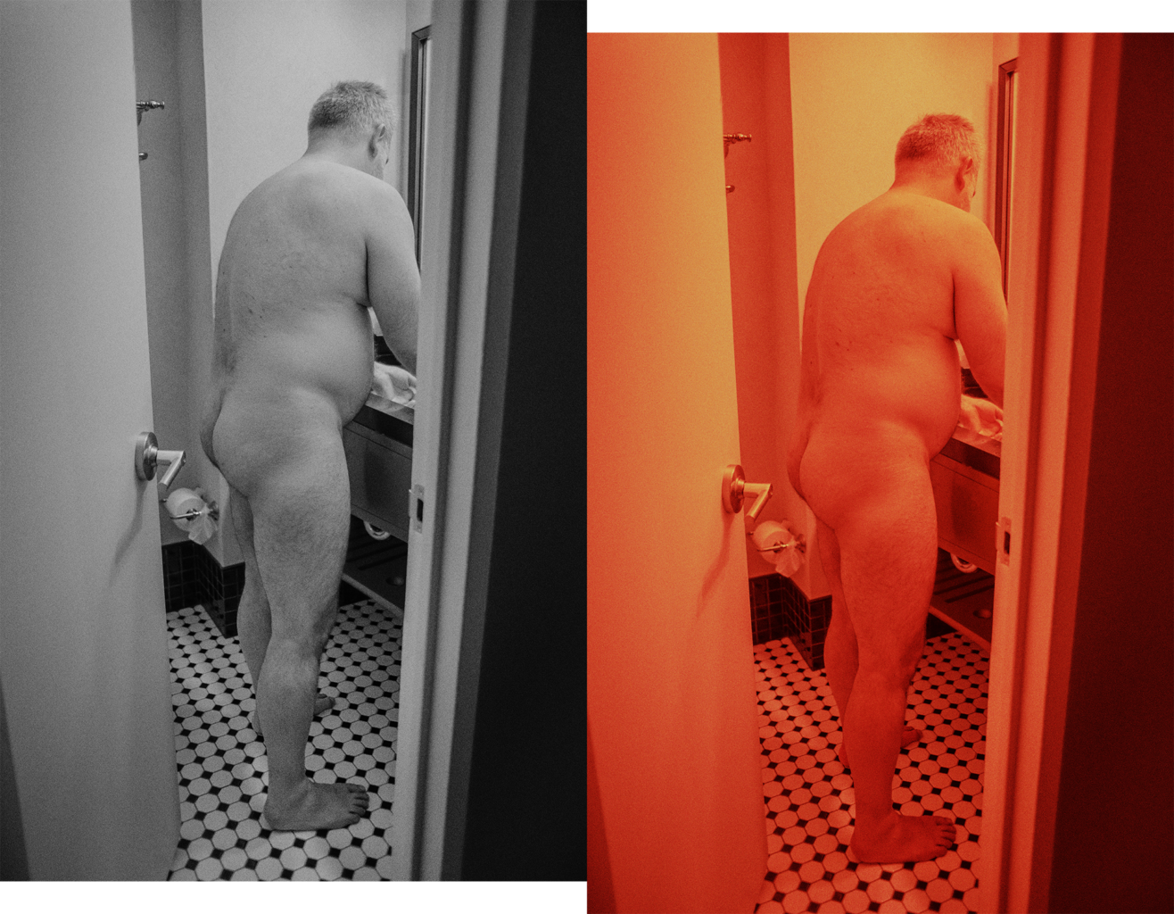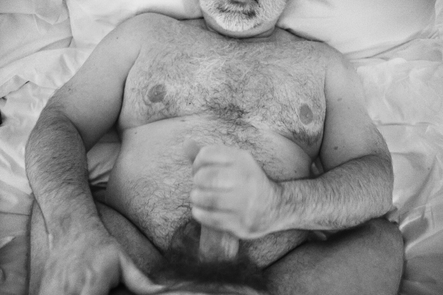 He was strong, with his chest hair sticking out, furry arms, and great legs. He walked into the lobby at the same time some friends were heading out.